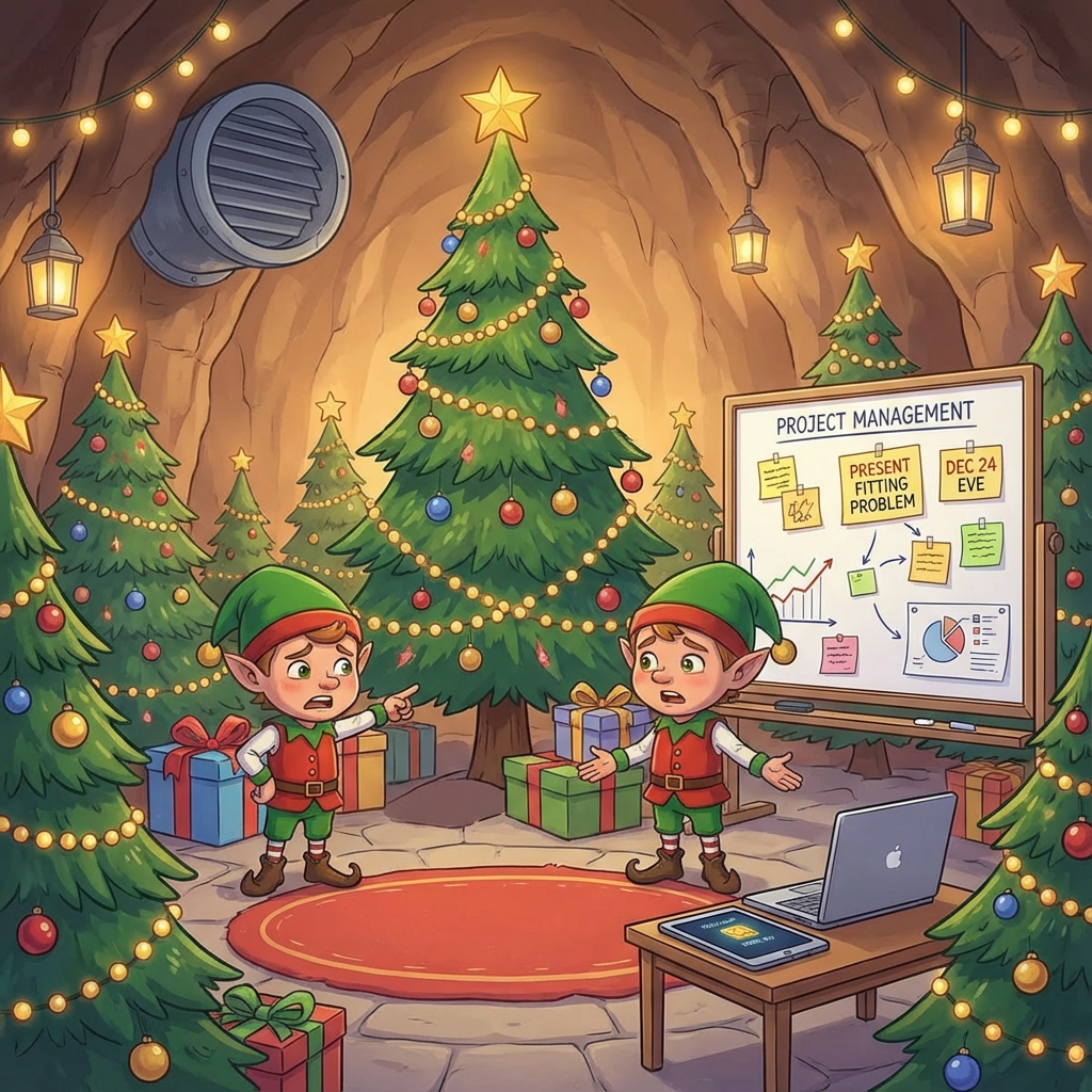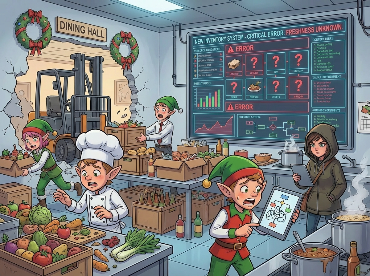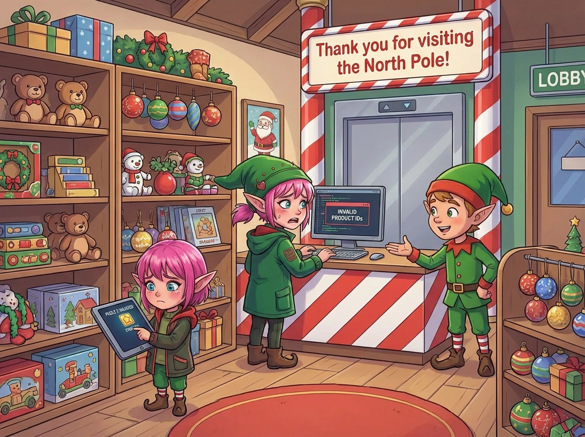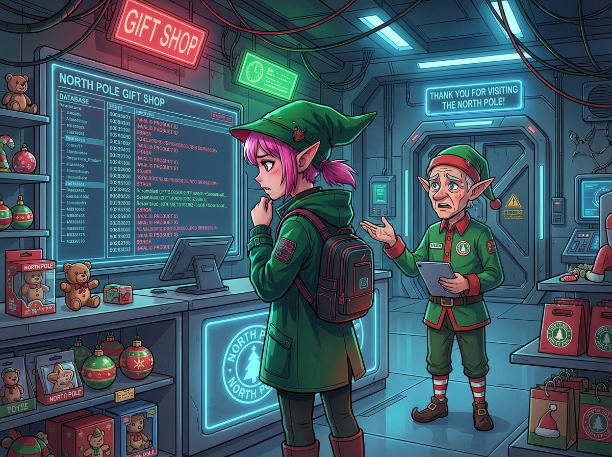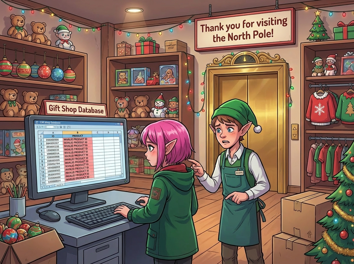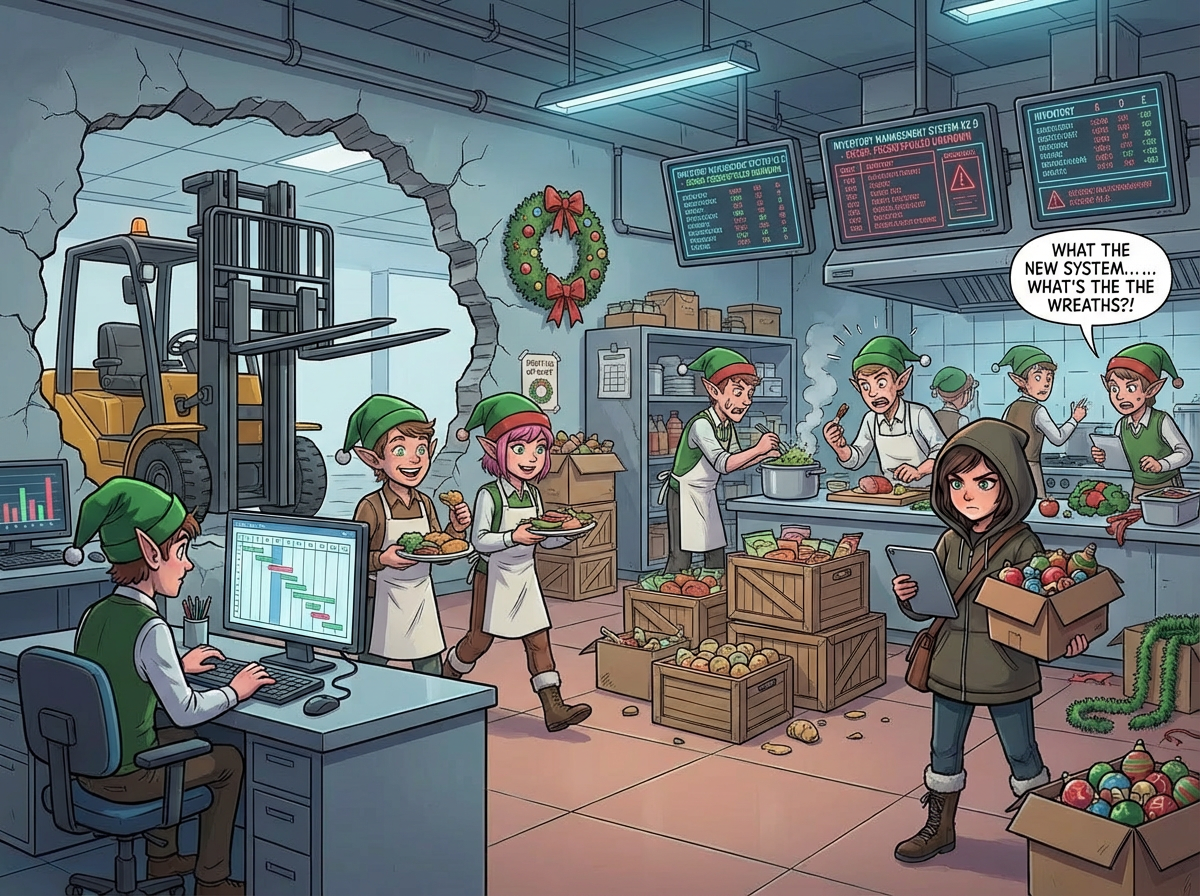 "If only we hadn't switched to the new inventory management system right before Christmas!" another Elf exclaims. You ask what's going on.