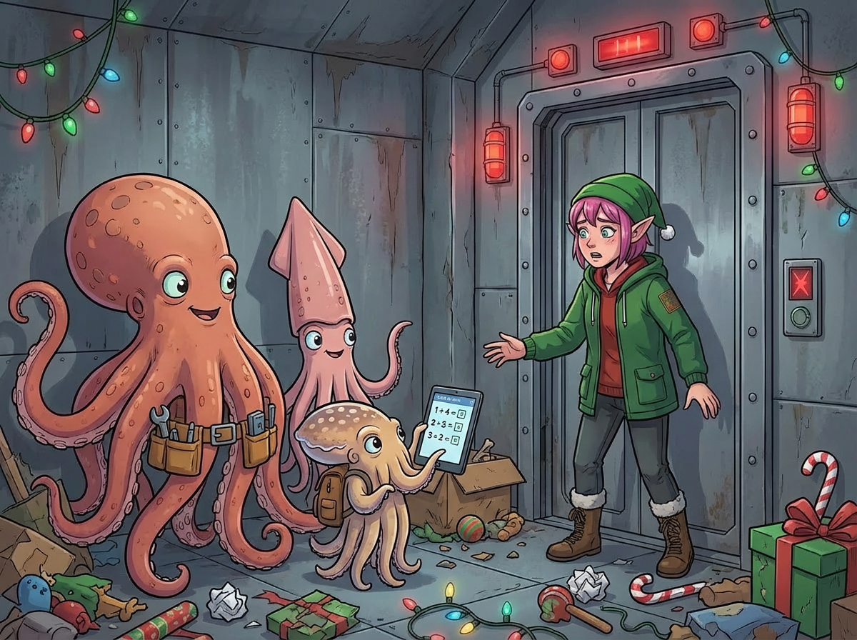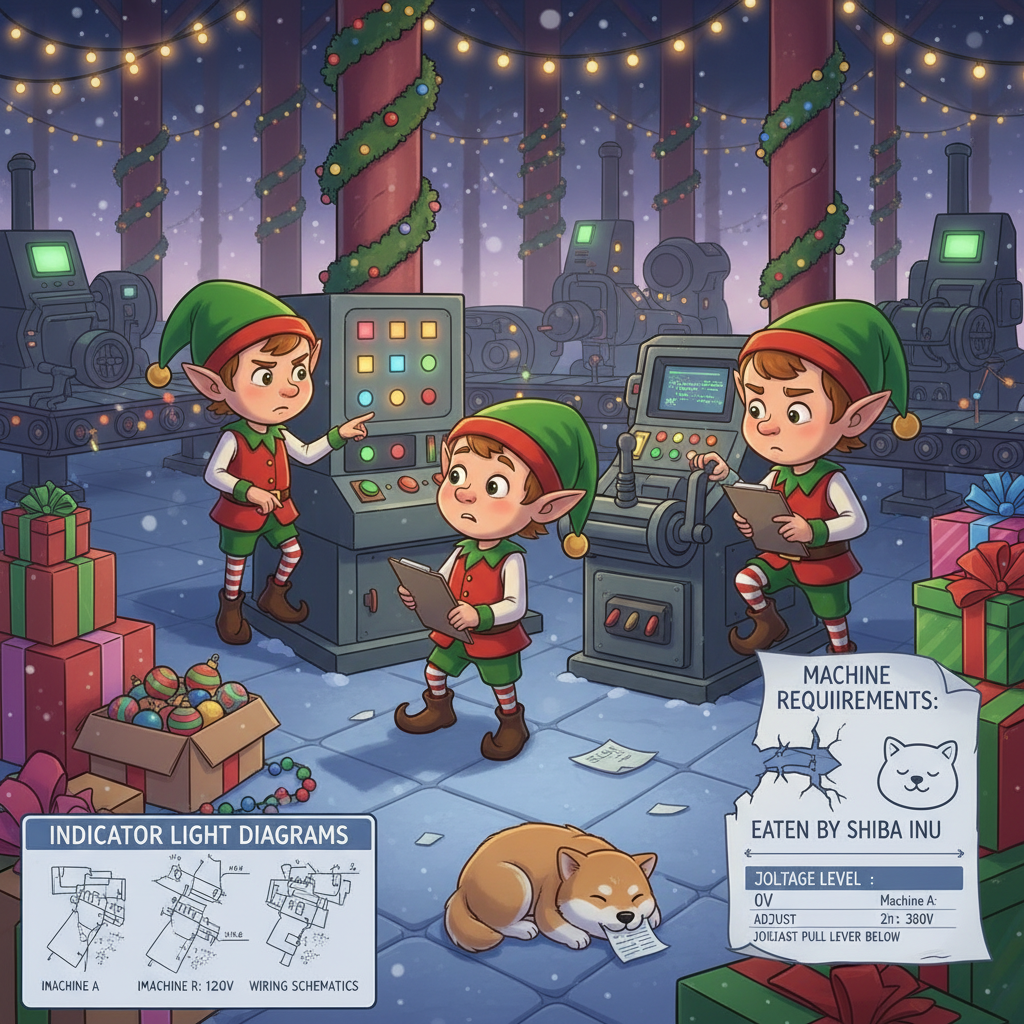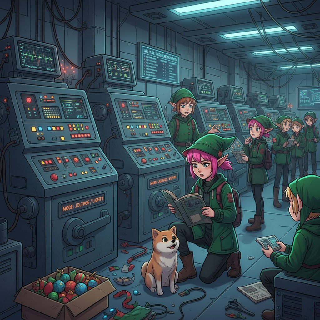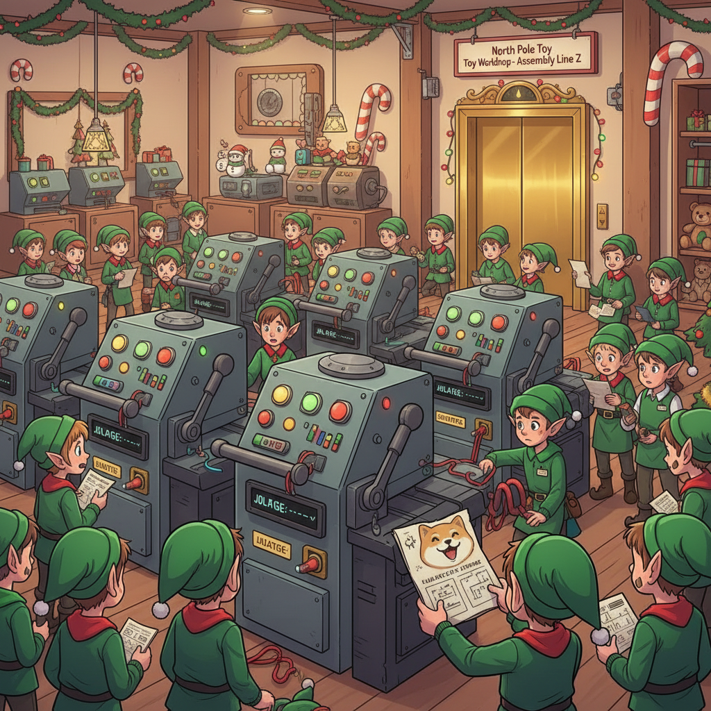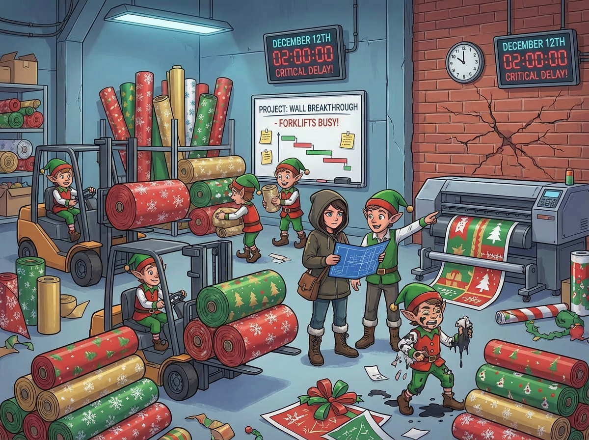 "If only we hadn't switched to the new inventory management system right before Christmas!" another Elf exclaims. You ask what's going on.