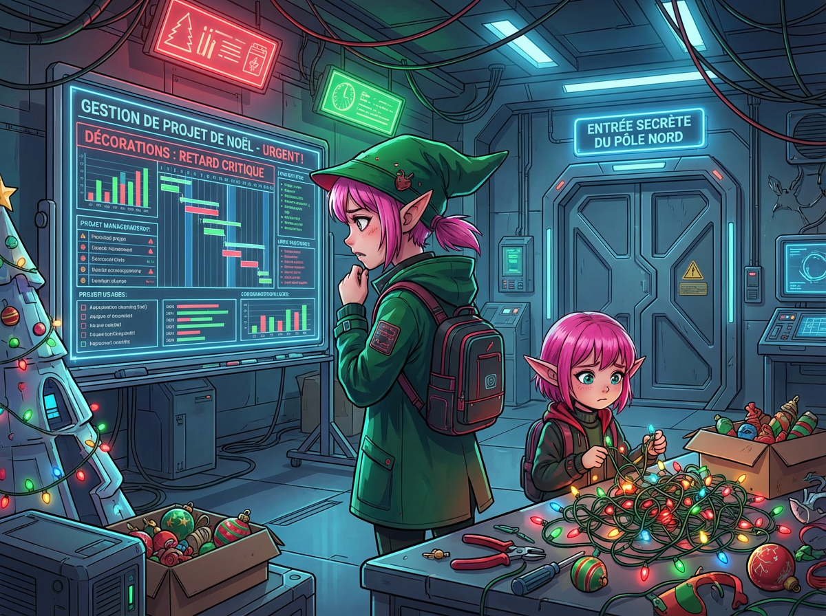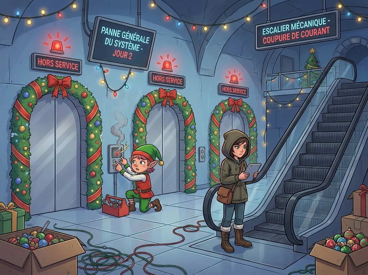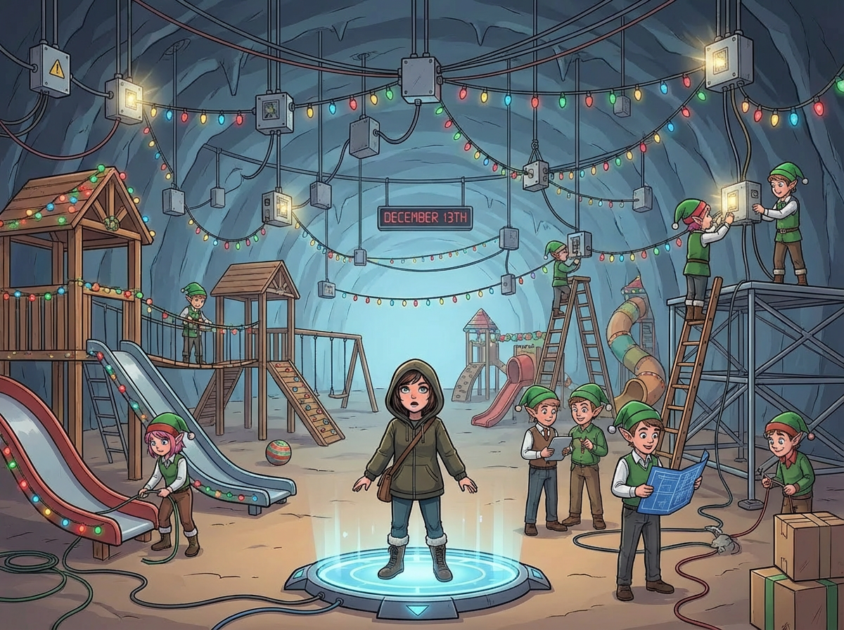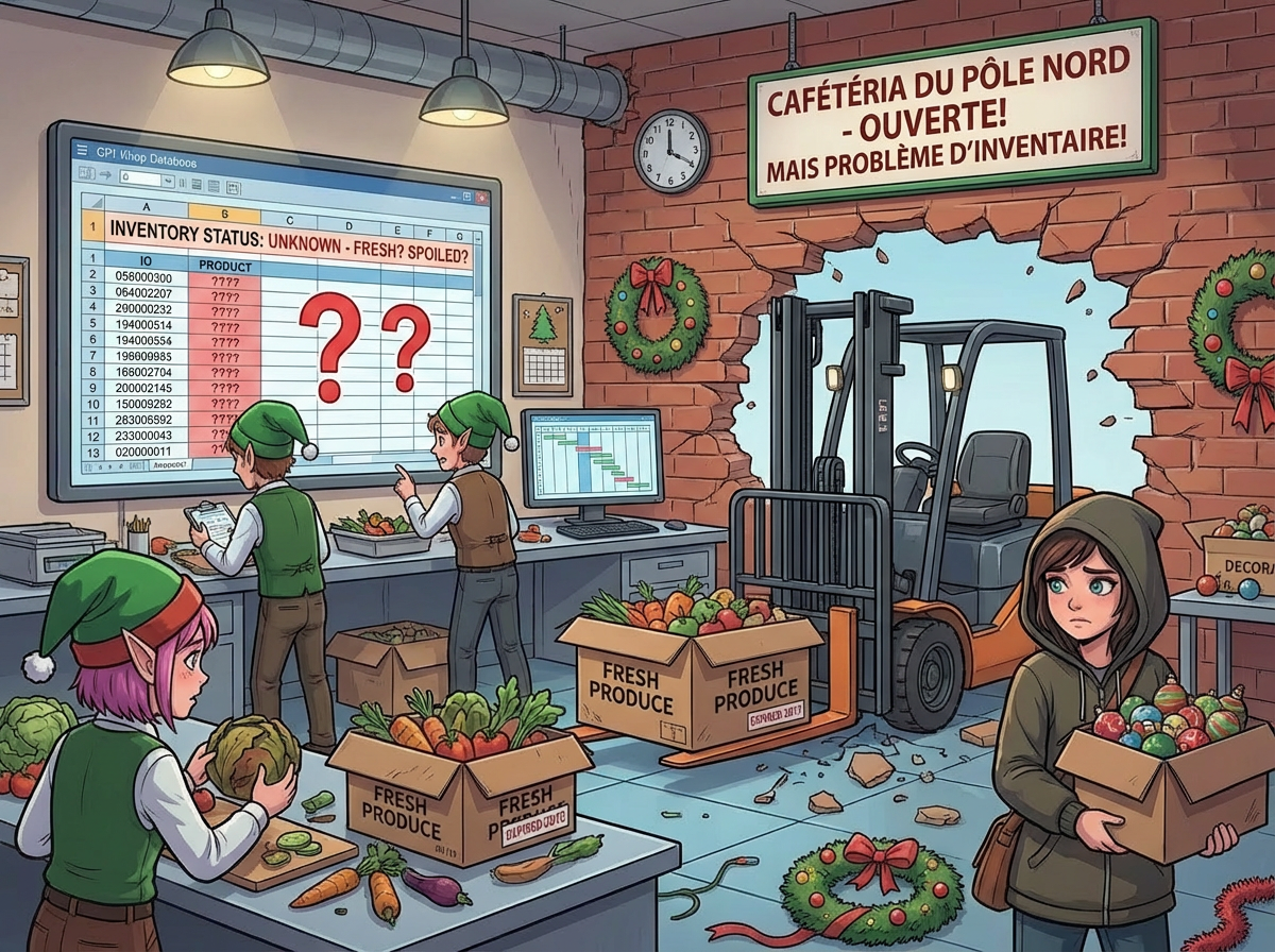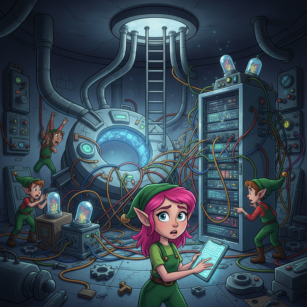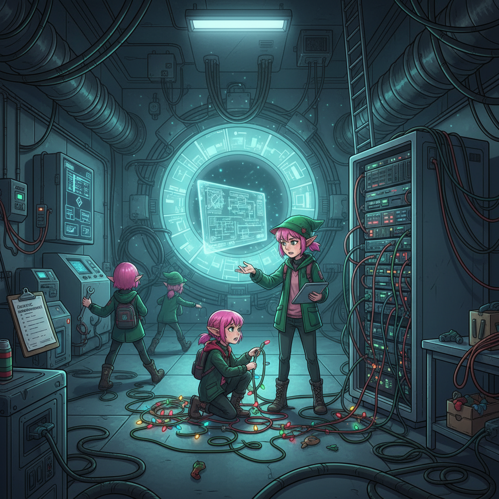 "If only we hadn't switched to the new inventory management system right before Christmas!" another Elf exclaims. You ask what's going on.