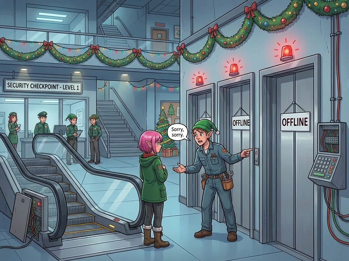 You descend a short staircase, enter the surprisingly vast lobby, and are quickly cleared by the security checkpoint. When you get to the main elevators, however, you discover that each one has a red light above it: they're all offline. "Sorry about that," an Elf apologizes as she tinkers with a nearby control panel. "Some kind of electrical surge seems to have fried them. I'll try to get them online soon."