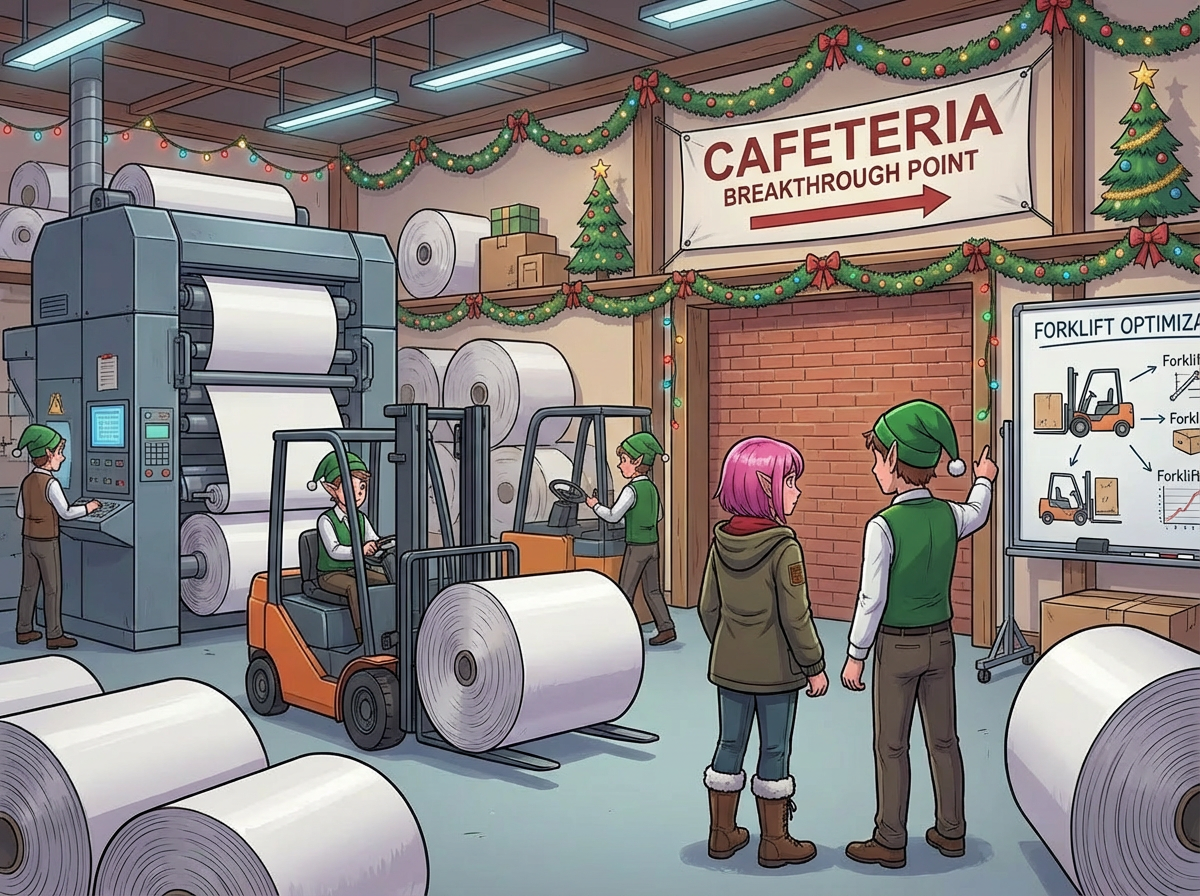 "Actually, maybe we can help with that," one of the Elves replies when you ask for help. "We're pretty sure there's a cafeteria on the other side of the back wall. If we could break through the wall, you'd be able to keep moving. It's too bad all of our forklifts are so busy moving those big rolls of paper around."