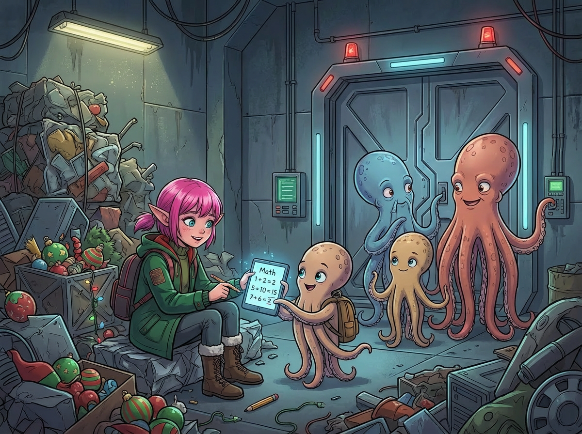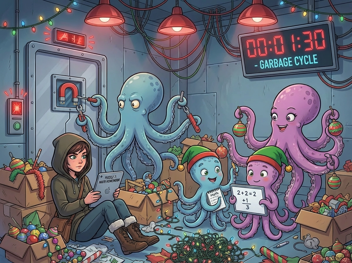 A brief fall later, you find yourself in a garbage smasher. Unfortunately, the door's been magnetically sealed. While you're trying to figure out how to escape, you are approached by a family of cephalopods! They're pretty sure they can get the door open, but it will take some time.