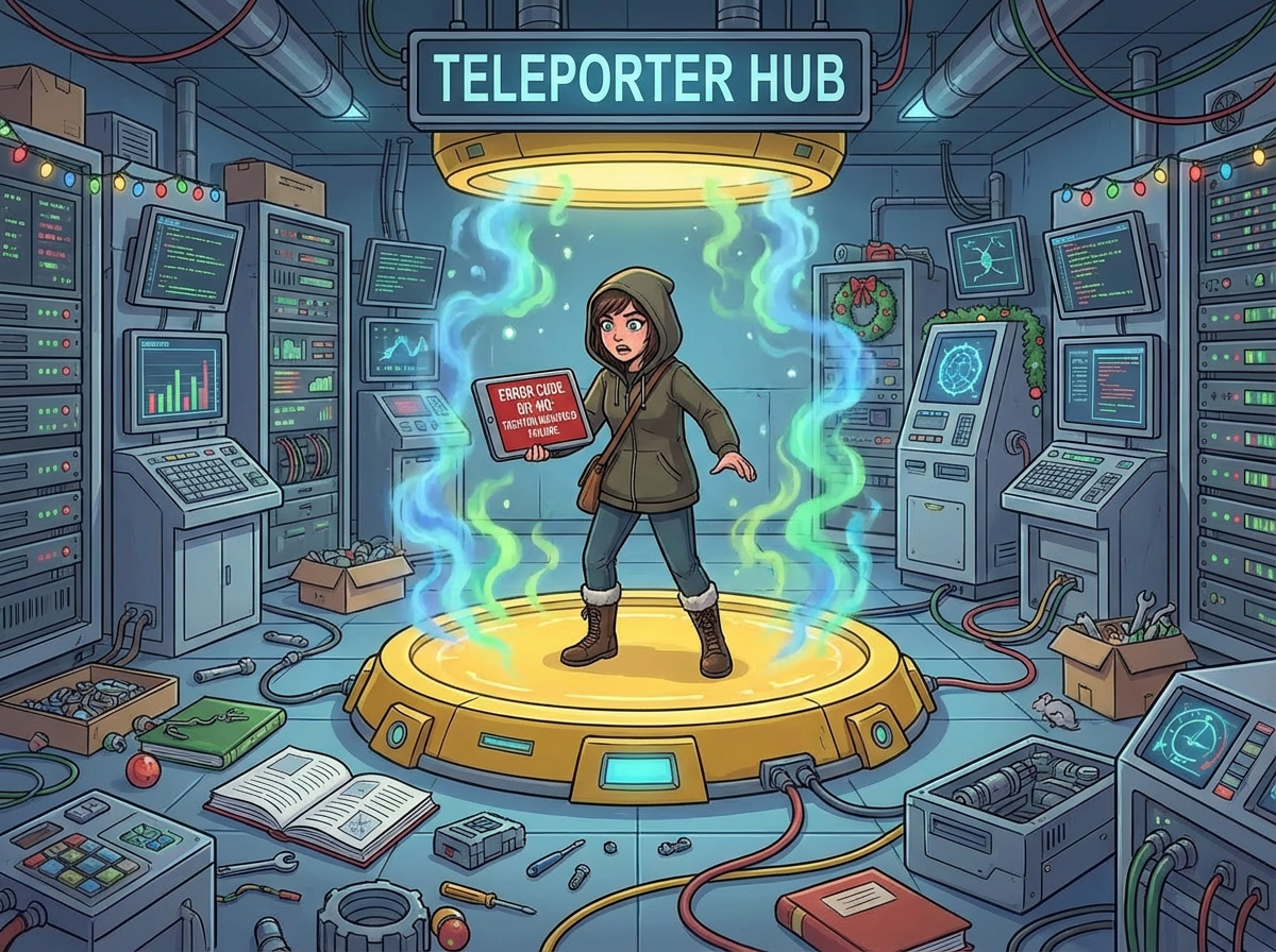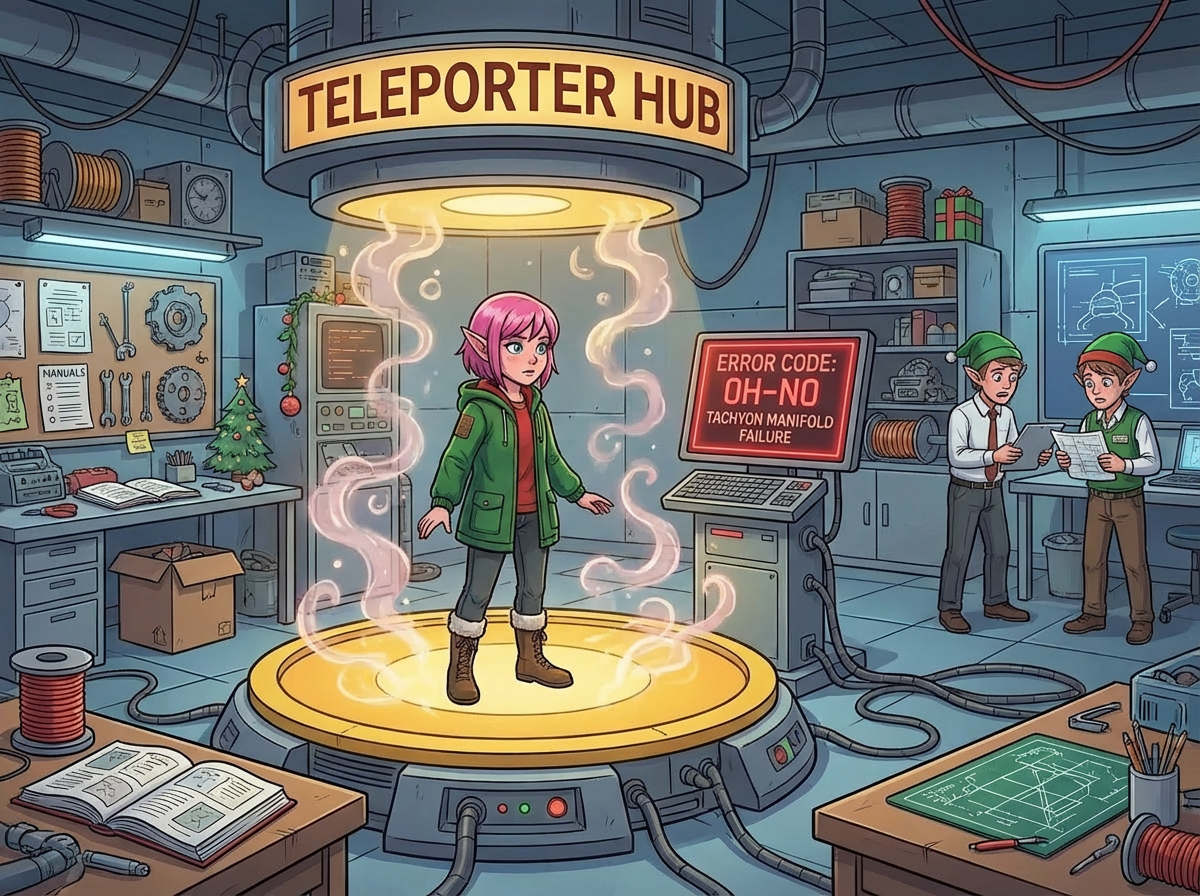 You're transported to an unfamiliar room! The room has no doors; the only way out is the teleporter. Unfortunately, the teleporter seems to be leaking magic smoke. Using the diagnostic equipment, you identify error code 0H-N0, indicating an issue with one of the tachyon manifolds.