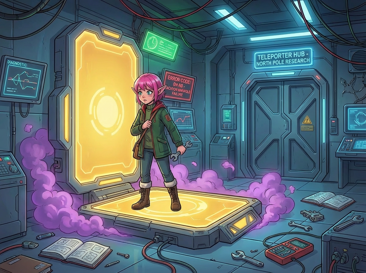 After thanking your cephalopod friends, you escape the trash compactor and find yourself in the familiar halls of a North Pole research wing. You discover a facility labeled "teleporter hub" and step onto a large yellow teleporter pad.