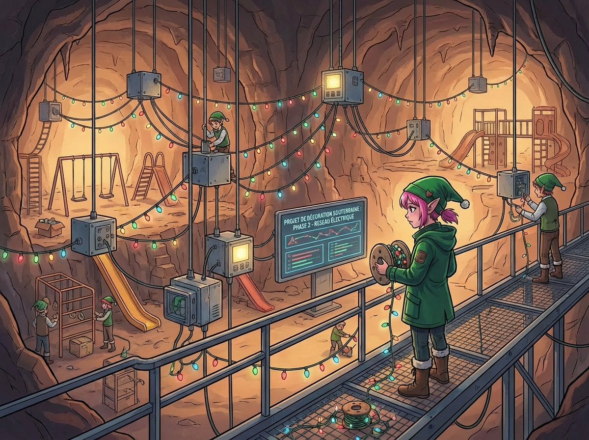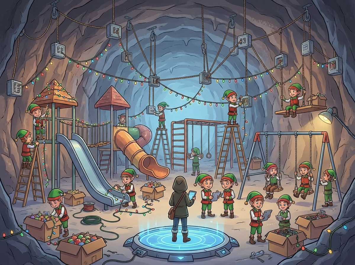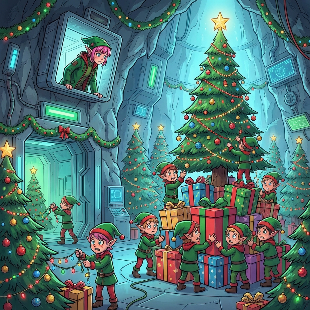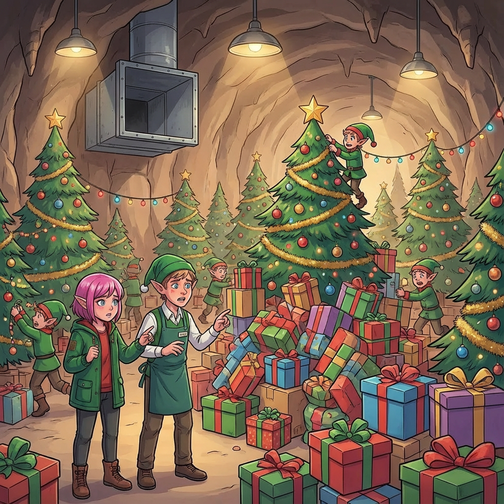 Racing against time, you discover a ventilation duct that leads to a large, well-lit cavern full of Christmas trees. A group of Elves are working frantically to decorate before the deadline.