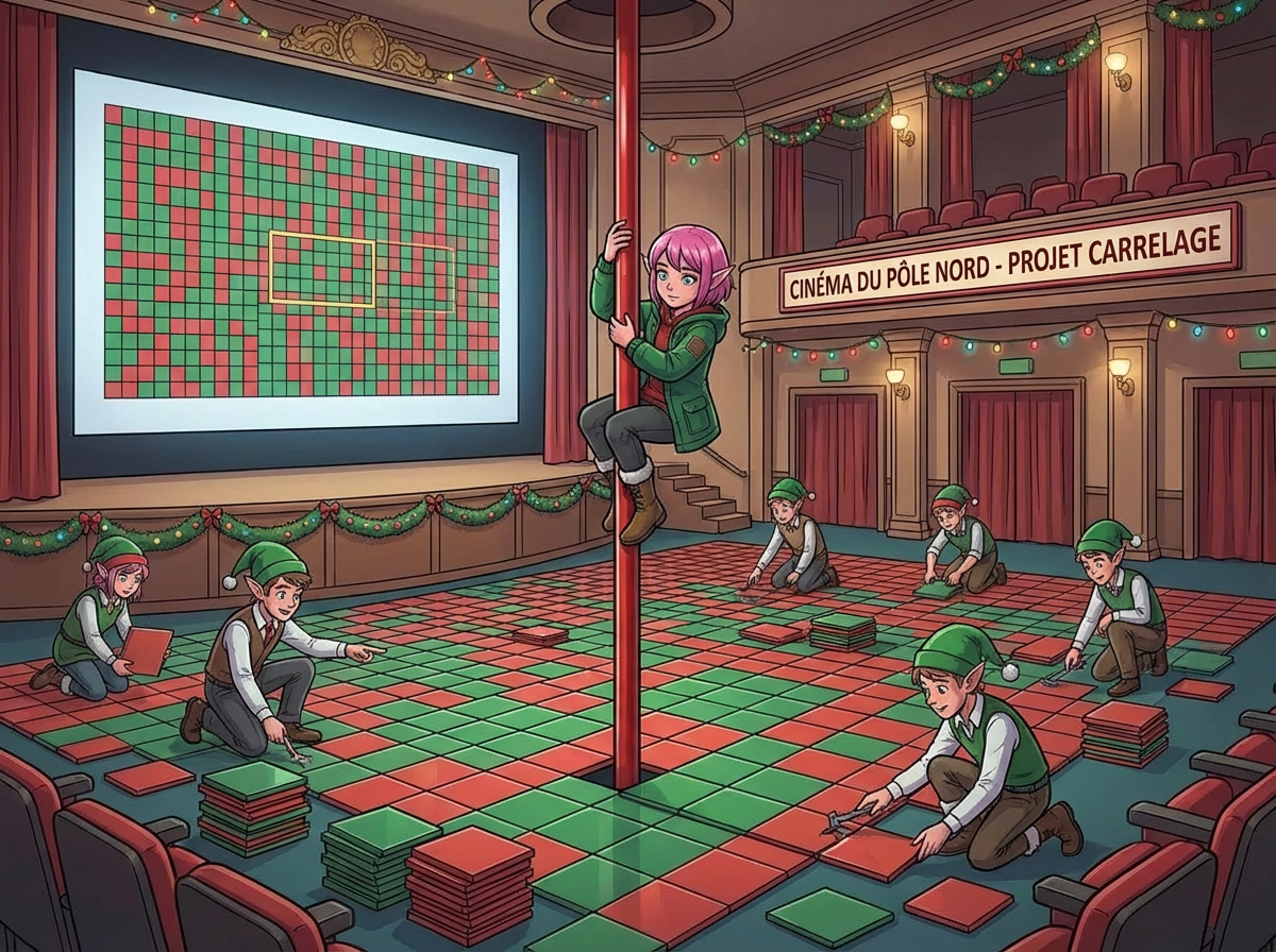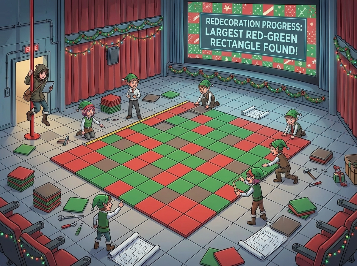The Elves are redecorating the theater by replacing tiles in a grid floor pattern. Some tiles are red, and the Elves need to identify the largest possible rectangle using red tiles as opposite corners.