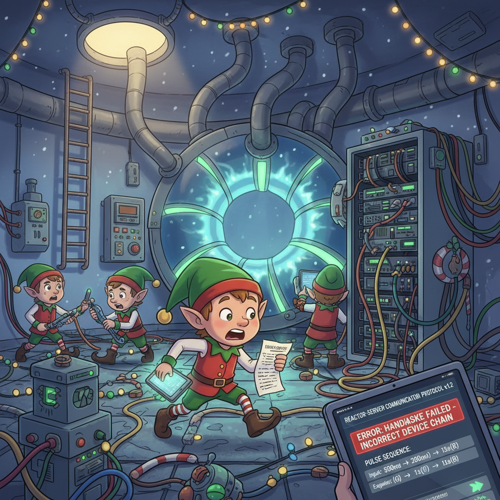 An Elf urgently explains: "We just installed a new server rack, but we aren't having any luck getting the reactor to communicate with it!" The team believes the issue is triggered by data following some specific path through the devices.
